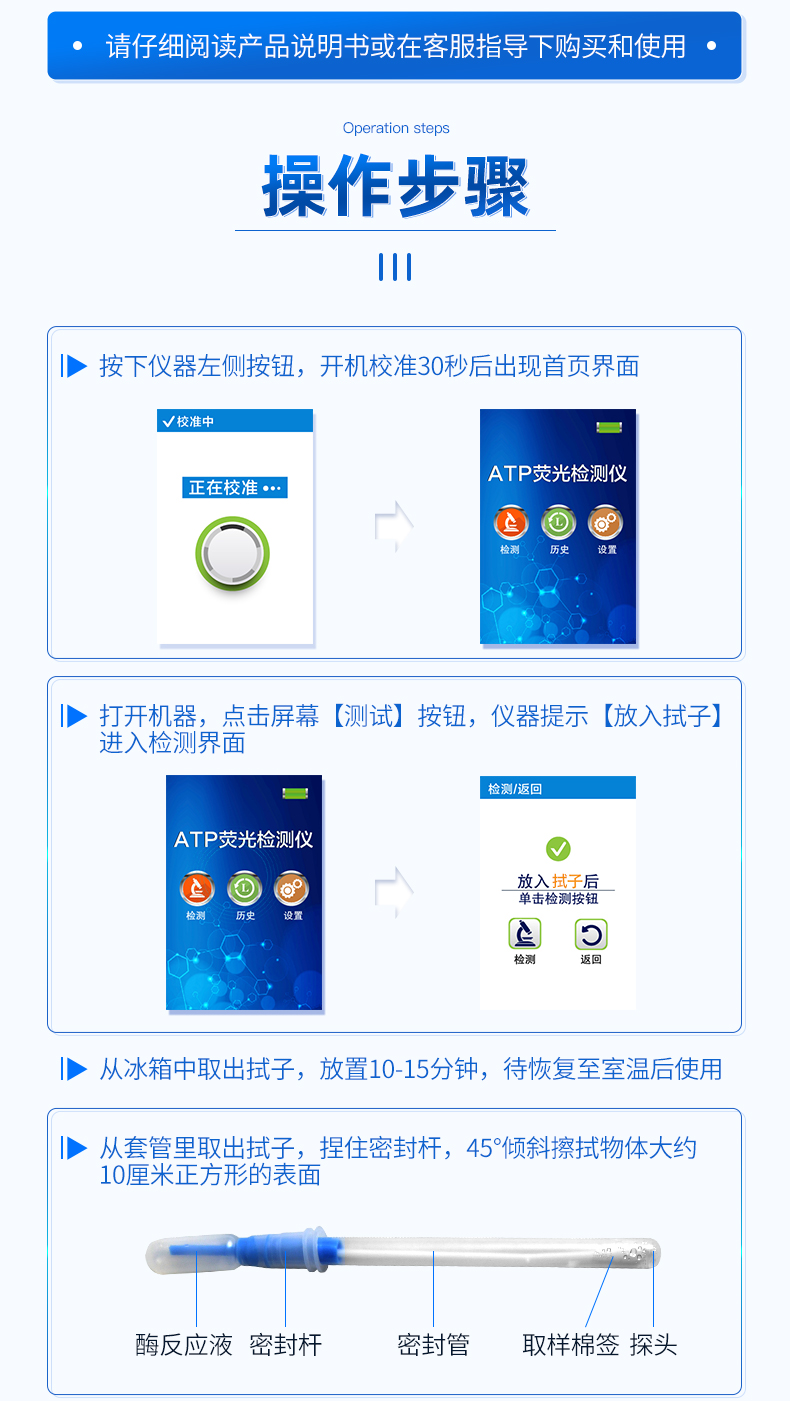 该设备为全新升级产品,大屏幕触摸显示屏,代替传统按键。操作采用生物化学反应方法检测ATP含量,ATP荧光检测仪基于萤火虫发光原理,利用“荧光素酶—荧光素体系”快速检测三磷酸腺苷(ATP)。ATP拭子含有可以裂解细胞膜的试剂,能将细胞内ATP释放出来,与试剂中含有的特异性酶发生反应,产生光,再用荧光照度计检测发光值,微生物的数量与发光值成正比,由于所有生物活细胞中含有恒量的ATP,所以ATP含量可以清晰地表明样品中微生物与其他生物残余的多少,用于判断卫生状况。