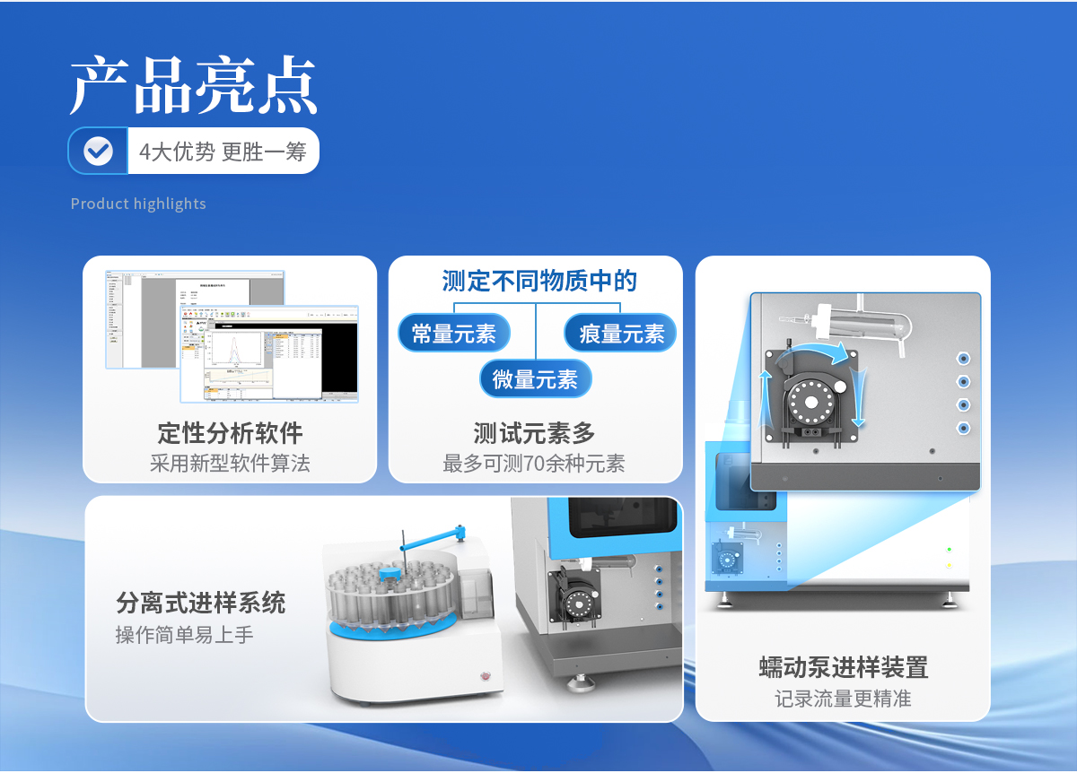 1、测试元素多,*多可测 70 余种元素。 2、多元素同时测试,一次进样所有元素同时测试。 3、分析速度快,每分钟约 5 个元素,*快测试速度可到每分钟 10 个元素。 4、检出限低,绝大多数元素可达 ppb 级。 5、线性范围宽,可达 5-6 个数量级,可以实现高低含量同时测试,无需更换标 准曲线。 6、化学干扰少,测试结果更加精准。