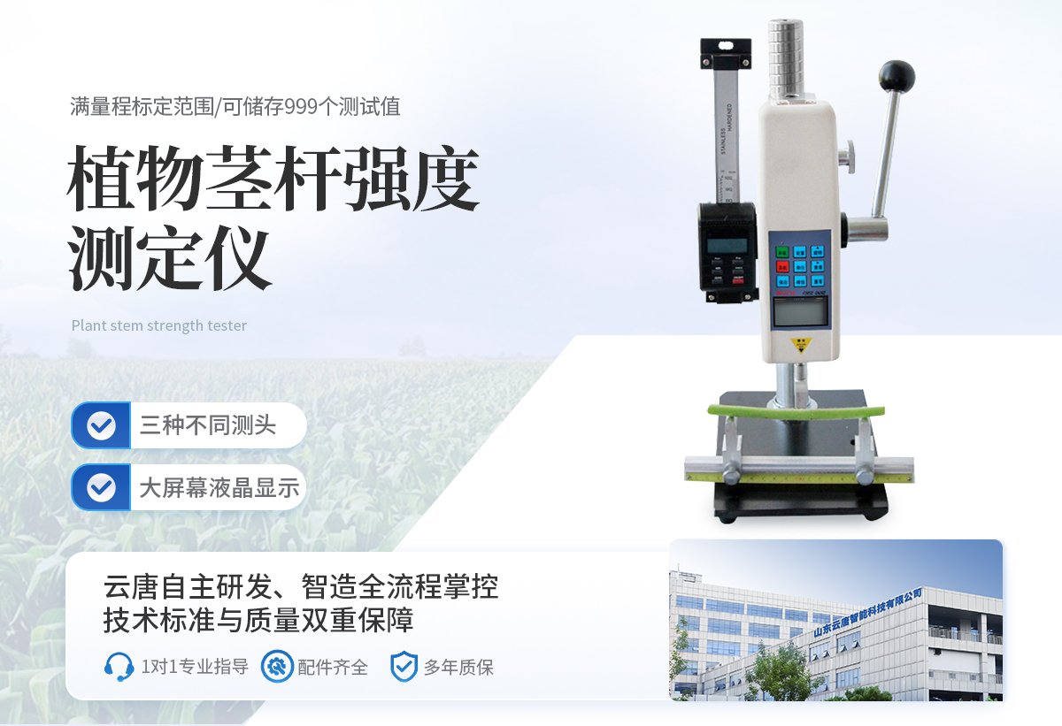 植物茎秆的强度是决定作物抗倒伏能力的一个主要因素,长期以来玉米,高梁、烟草等的倒伏给作物的机械收割造成很大的困难。从机械化水平来说,造成大量的粮食浪费。另外,作物倒伏导致光照不充分,使其生产量受到极大的限制。在作物生长的各个阶段对其茎秆进行活体测量,进而根据茎杆纤维层的抗弯阻力与抗倒伏能力的相关性对群体测量数据进行统计处理,对作物的栽培和育种具有重要意义。植物茎秆强度仪采用拉压力传感器,通过针刺、压碎、折断的方式测出茎秆断裂或者屈服瞬间产生的**力,即茎秆的强度