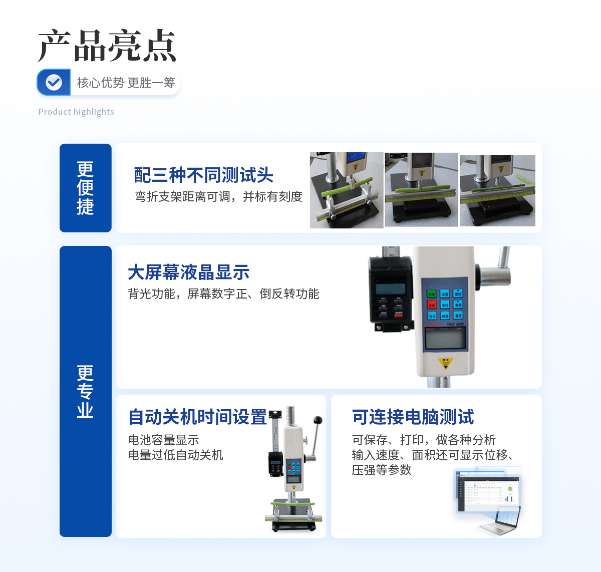 | 1、三种不同测头:可进行茎杆弯折性能测量、茎秆抗压强度测量、茎杆组织结构(穿刺)强度测量;弯折支架距离可调,并标有刻度。 | 2、可配测位移标尺 | 3、可连接电脑测试,可保存、打印,做各种分析,输入速度、面积还可显示位移、压强等参数; | 4、可储存999个测试值; | 5、大屏幕液晶显示,有背光功能,并具有屏幕数字正、倒反转功能; | 6、自动关机时间设置; | 7、电池容量显示,电量过低自动关机。 |
