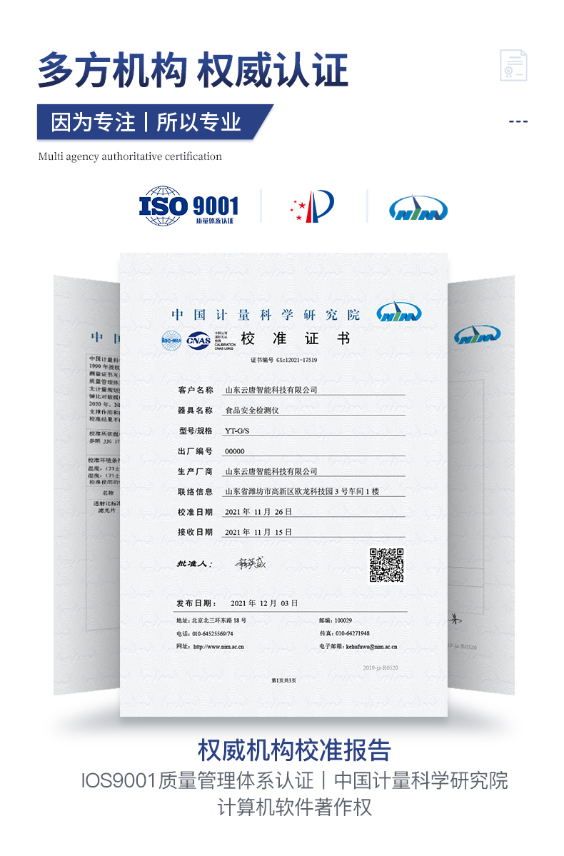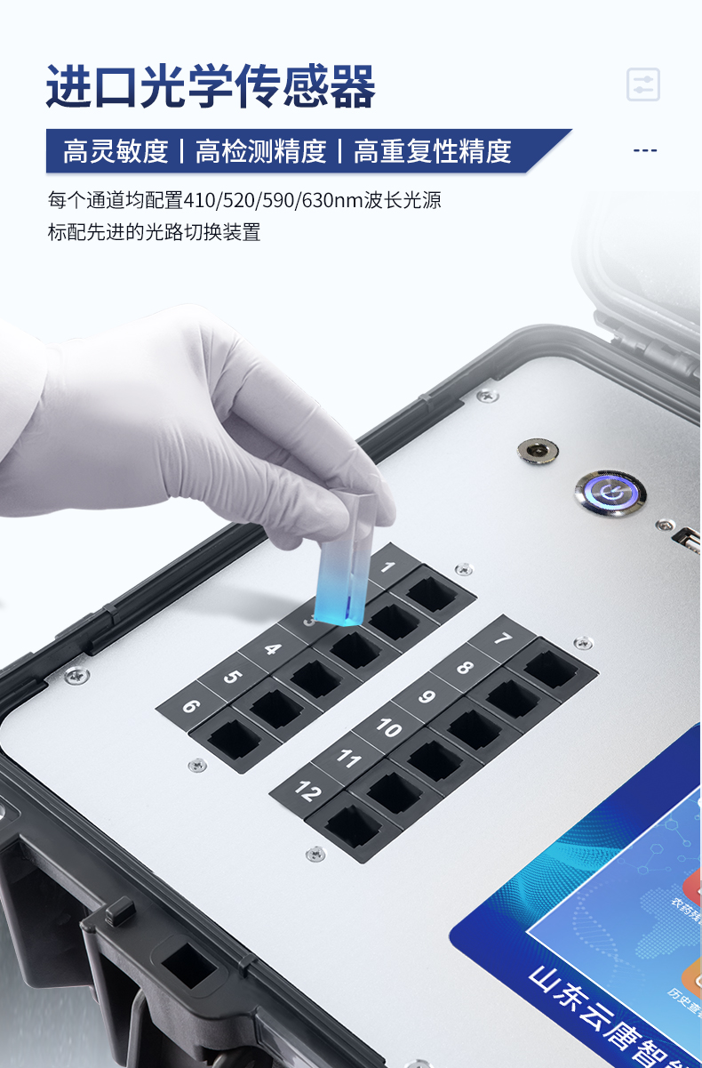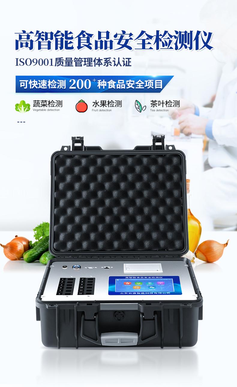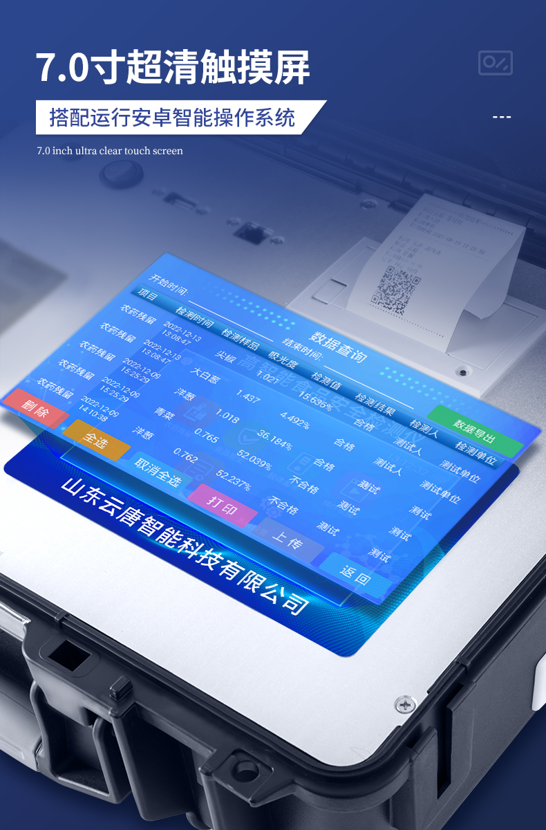 | 该仪器通过光电子技术对反应生成物的反射率进行分析测试,定量或定性分析样品中待测物的含量。 | 安卓智能操作系统,7英寸高灵敏真彩触摸屏,更加**和人性化操作, | 仪器具有4G无线联网、wifi联网上传、GPRS无线远传功能,快速上传数据。 | 便携式仪器,便于现场携带操作,主机重量不大于3kg。 | 具有可见光光源,可检测可见光信号,检测值0~30000。 | 具有常用打印机数据线接口,直接打印结果;配备USB接口,可连接网络。 | 具有多个食品安全检测项目,开放平台,可以增减检测项目。 | 检测通道:12个检测通道,可以同时测试多个样品,每个样品由程序控制分别独立工作,不会互相干扰。 | 以模拟反射率的标准片为50%附近时为代表,精密度CV值≤0.8%。 | 供电电源:(220±22V)~50Hz±1Hz,供电电源电压波动不应超过220V AC±10%。 | 内置打印机,实时打印检测结果。内置大容量电池,便于现场执法检测。 | 高灵敏度,高检测精度,高重复性精度,扫描式高精度光学传感器。 | 机身储存上万条检测结果,也可以导出储存。 | 开放端口,可连接监管平台数据库,界面有上传操作。 |