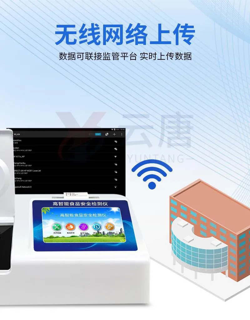 8、仪器带有监管平台。数据可局域网和互联网数据上传,检测结果直接传至食品安全监管平台。进行区域食品安全监管及大数据分析处理,检测区域食品安全长短期动态,达到食品安全问题预估、预警