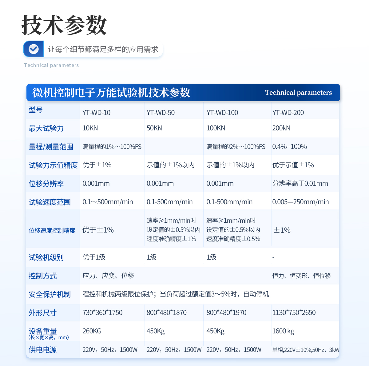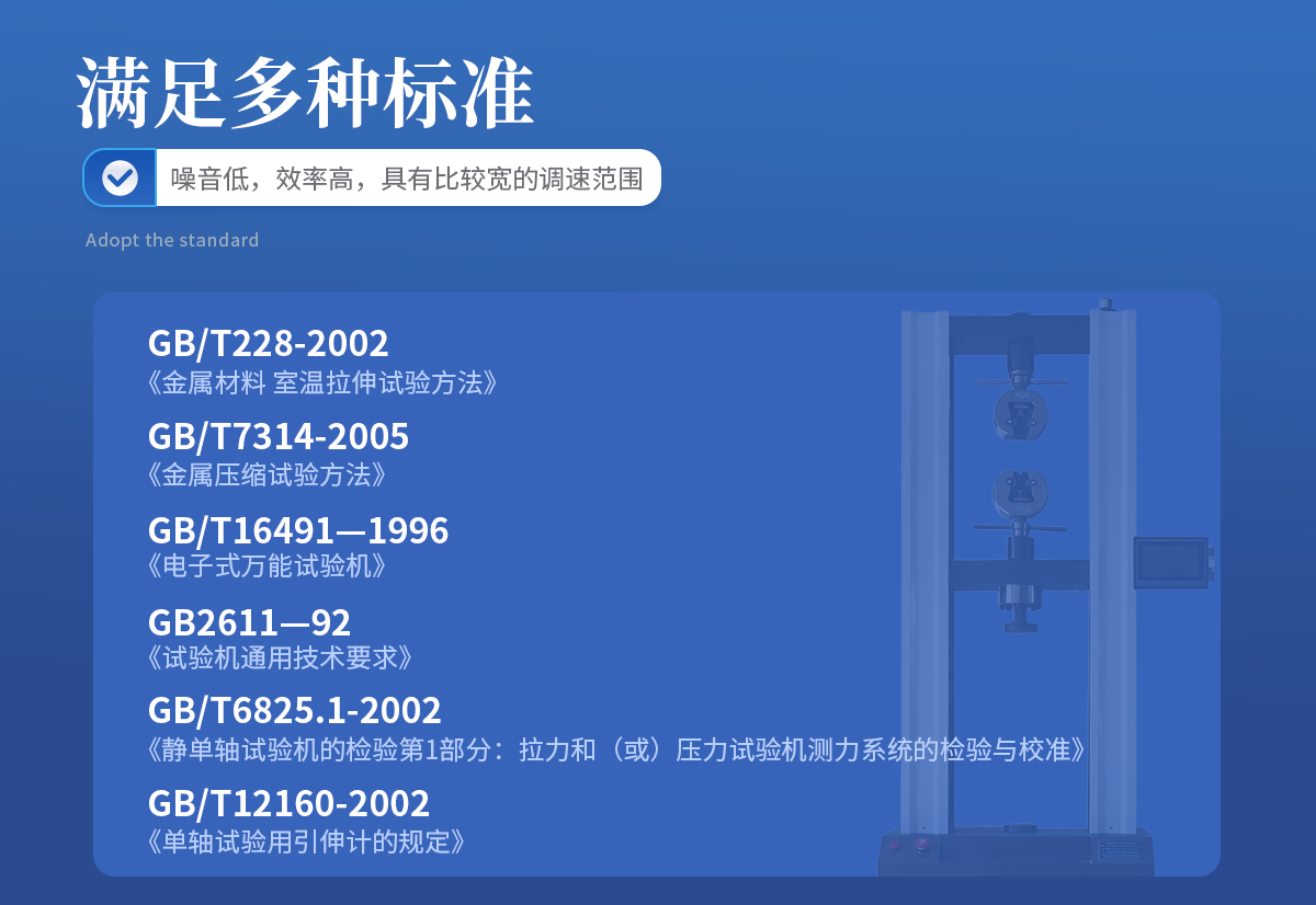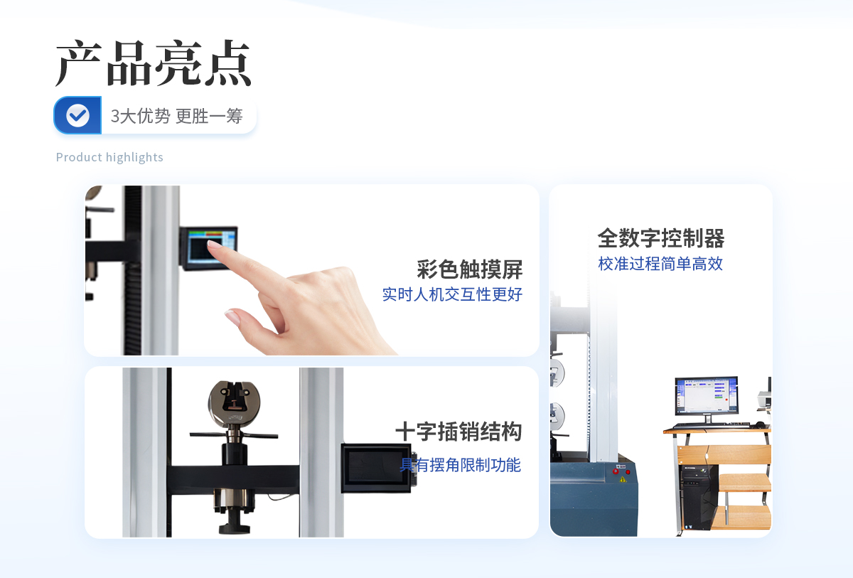 | 1、采用高精度、全数字调速系统及精密减速机,驱动精密丝杠副进行试验,实现试验速度的大范围调节,试验过程噪音低、运行平稳。 | 2、万向节采用十字插销结构,而且具有摆角限制功能,一方面便于试样夹持,保证试验同心度,另一方面很好的消除了不规则试样对传感器的影响。 | 3、触摸键操作方式,液晶显示器实时显示。显示界面可显示试验方法选择界面、试验参数选择界面、试验操作及结果显示界面和曲线显示界面,方便快捷。 | 4、可实现试样装夹时横梁快慢升降调整,具有过流、过压、过载等保护装置。 | 5、选配微机接口,可外接微机实现试验过程的控制及数据的存储、打印。 |