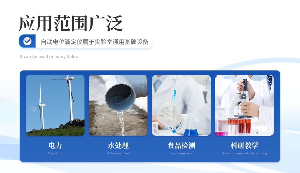 自动电位滴定仪属于实验室通用基础设备,使用非常广泛,可应用在食品、药检、疾控、商检、水处理、石油、化工、海洋、电力、环保、新能源、教学、科研等相关领域。