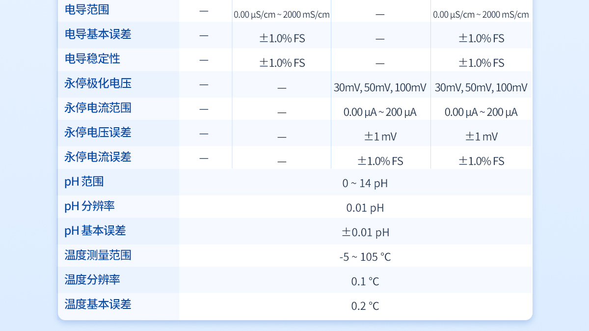 滴定分析重复性:≤0.2%滴定分析误差:≤1.5%10mL滴定管滴定容量精度:±5μL20mL滴定管滴定容量精度:±10μL10mL滴定管滴定容量误差:10μL/10mL20mL滴定管滴定容量误差:20μL/10mL电位范围:-2000—2000mV电位分辨率:0.1mV电位基本误差mV:±0.25‰/FS电位稳定性mV:±0.3mV/3h永停极化电压:30mV、50mV、100mV永停电流范围:0.00uA-200uA永停电压误差:±1mV永停电流误差:±1.0% FSpH范围:0-14PHpH分辨率:0.01PHpH基本误差:±0.01PH温度测量范围:-5 - 105℃温度分辨率:0.1℃温度基本误差:0.2℃