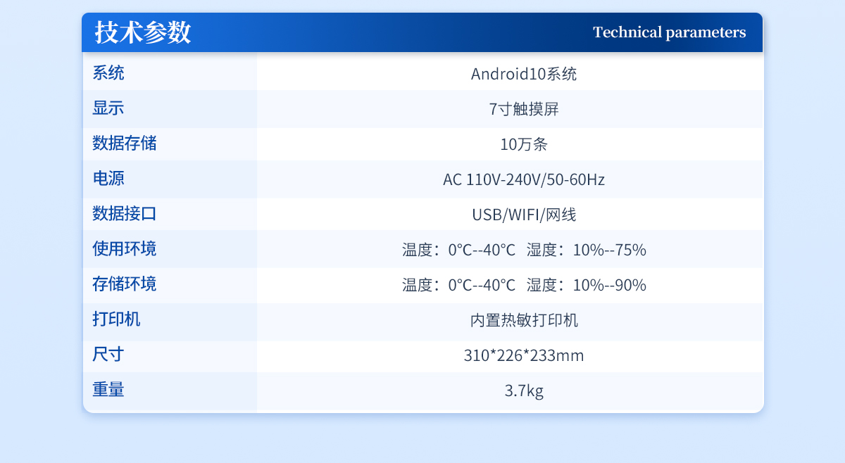 系统:Android10系统显示:7寸触摸屏数据存储:10万条电源:AC 110V-240V/50-60Hz数据接口:USB/WIFI/网线使用环境:温度:0℃--40℃   湿度:10%--75%存储环境:温度:0℃--40℃   湿度:10%--90%打印机:内置热敏打印机尺寸:310*226*233mm重量:3.7kg