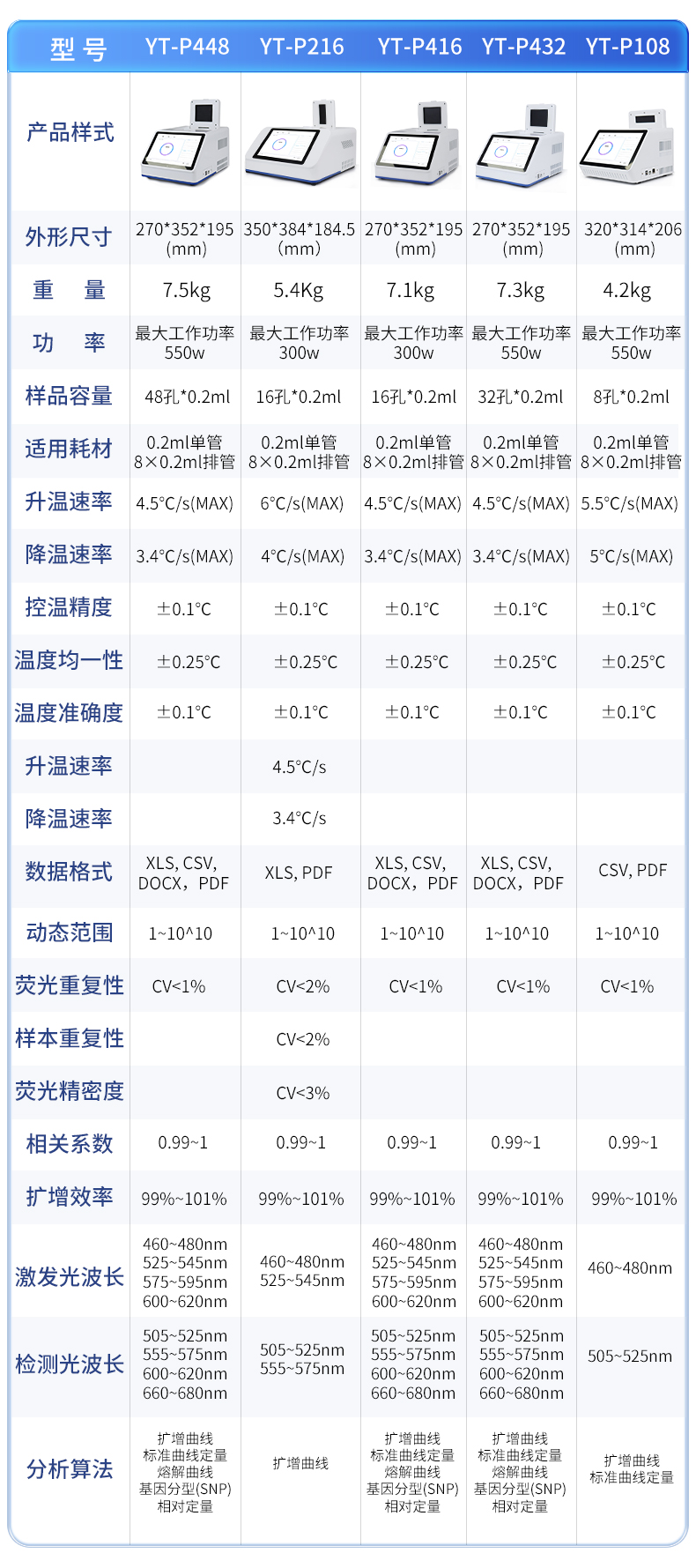 | 基本性能 | 外形尺寸:270*352*195 (mm) | 重量:7.3kg | 电源:220V | 功率:**工作功率550w | 操作系统:自带Android操作系统 | 外接电脑:外接windows电脑(win7系统以上) | 系统语言:中英文实时切换 | 通信接口:方形USB | 操作环境参数 | 操作环境温度:18~35℃ | 操作环境相对湿度:0%~85% | 运输及储存温度:-20~55℃ | 运输及储存相对湿度:0%~85% | 系统性能 | 样品容量:32孔*0.2ml | 样品容积:15~100ul | 适用耗材:0.2ml单管、8×0.2ml排管 | 控温范围:4~99℃ | 热盖温度:30℃-108℃(默认105℃,热盖温度可调) | 温控方式:高性能进口半导体 | 梯度控温:3模块梯度控温,**温差支持35℃ | 升温速率:4.5℃/s(MAX) | 降温速率:3.4℃/s(MAX) | 控温精度:±0.1℃ | 温度均一性 :±0.25℃ | 温度准确度:±0.1℃ | 操作功能:预设项目和分析参数,操作简单方便 | 报告:支持报告自定义模块,32孔分项目打印 | 分析功能:具多重qPCR数据分析功能,可同时检测4个检测通道 | 断电保护:可以一键重启中断的实验 | 仪器信息:拥有故障记录,分析,提示的功能,更方便远程解决问题 | 分析算法:扩增曲线,标准曲线定量、熔解曲线,基因分型(SNP),相对定量 | 支持HRM检测:支持 | 数据导出:可将实验结果以图形和表格的形式直接导出;详细的数据报告内容包括实验条件,数据坐标和表格,数据分析参数。 | 数据格式:XLS, CSV, DOCX,PDF | TouchDown功能:支持时间和温度递增递减模式 | 荧光检测系统性能 | 检测灵敏度:可检测单拷贝基因 | 动态范围:1~10^10 | 荧光重复性:CV<1%(使用某品牌试剂做32孔均一性实验,32个孔的Ct差值保持在0.5以内,CV保持在1%以内。) | 相关系数:0.99~1(每种浓度3个重复,梯度曲线的相关系数>0.99,扩增效率保持在99%~101%之间) | 扩增效率:99%~101% | 可信度:区分1000与2000拷贝浓度差异 | 激光光源:大功率LED(免维护,寿命长) | 检测器:高灵敏度光电传感器 | 激发和检测传播介质:耐高温专业导光光纤 | 激发光波长 :460nm~480nm , 525nm~545nm, 575nm~595nm ,600nm~620nm | 检测光波长 :505nm~525nm , 555nm~575nm , 600nm~620nm , 660nm~680nm |