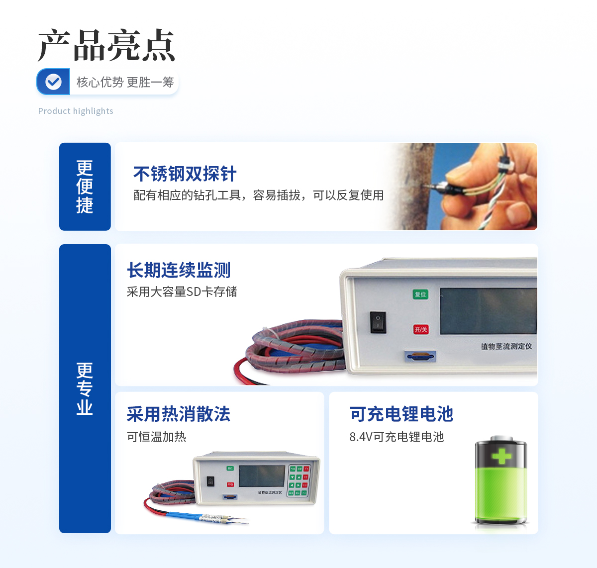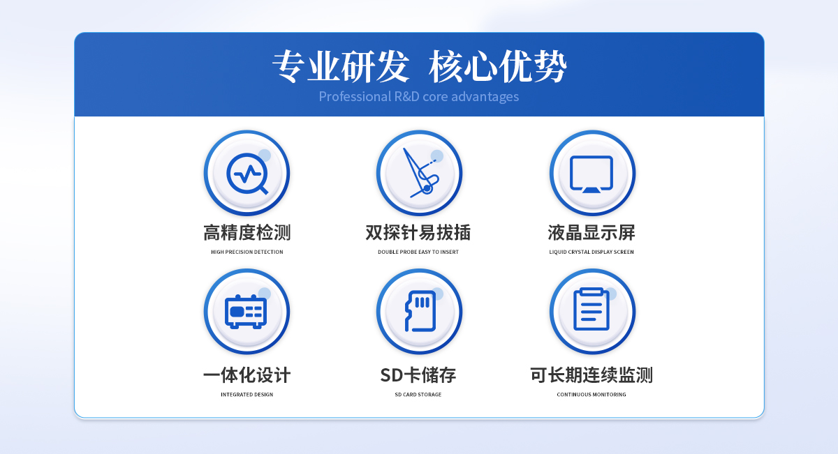 | 双探针,配有相应的钻孔工具,容易插拔,可以反复使用 | 采用热消散法,可恒温加热 | 可以长期连续监测 | 不锈钢探针,采用Teflon涂层,持久耐用 | 采用高精度T型热电偶直接与数据分析仪连接 | 采用大容量SD卡存储 |