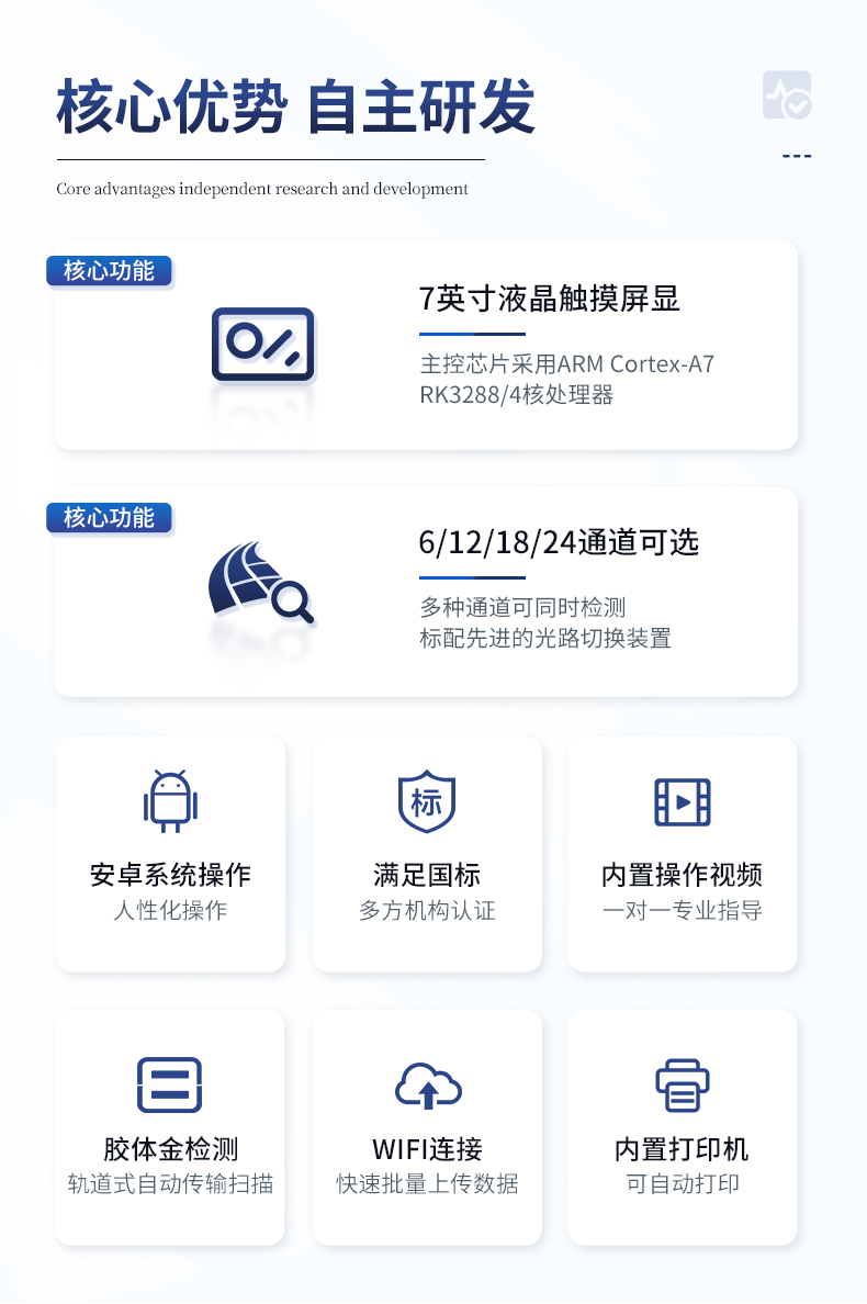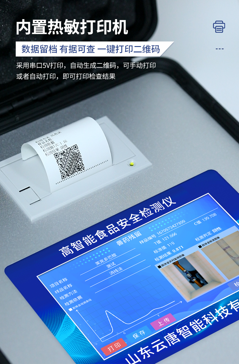 | 该仪器通过光电子技术对反应生成物的反射率进行分析测试,定量或定性分析样品中待测物的含量。 | 安卓智能操作系统,7英寸高灵敏真彩触摸屏,更加**和人性化操作, | 仪器具有4G无线联网、wifi联网上传、GPRS无线远传功能,快速上传数据。 | 便携式仪器,便于现场携带操作,主机重量不大于3kg。 | 具有可见光光源,可检测可见光信号,检测值0~30000。 | 具有常用打印机数据线接口,直接打印结果;配备USB接口,可连接网络。 | 具有多个食品安全检测项目,开放平台,可以增减检测项目。 | 检测通道:12个检测通道,可以同时测试多个样品,每个样品由程序控制分别独立工作,不会互相干扰。 | 以模拟反射率的标准片为50%附近时为代表,精密度CV值≤0.8%。 | 供电电源:(220±22V)~50Hz±1Hz,供电电源电压波动不应超过220V AC±10%。 | 内置打印机,实时打印检测结果。内置大容量电池,便于现场执法检测。 | 高灵敏度,高检测精度,高重复性精度,扫描式高精度光学传感器。 | 机身储存上万条检测结果,也可以导出储存。 | 开放端口,可连接监管平台数据库,界面有上传操作。 |