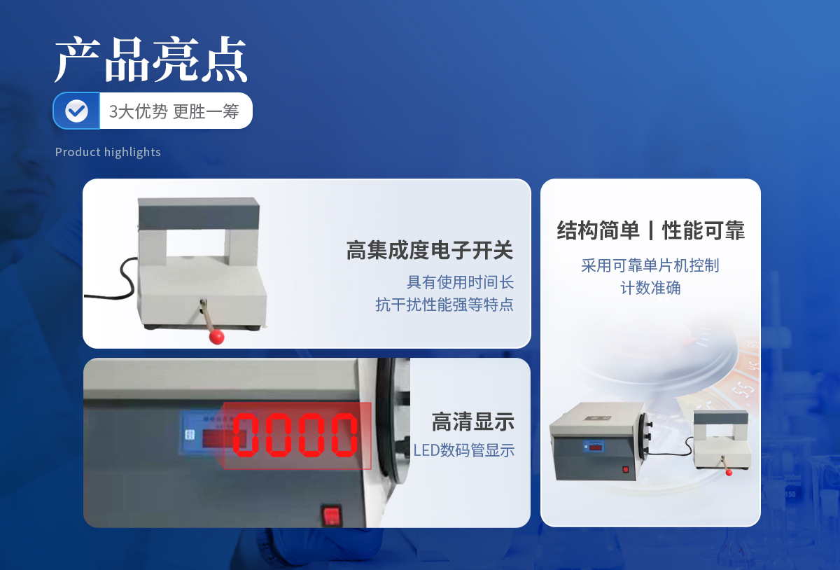 | 1.转鼓传感器采用进口高集成度电子开关,具有使用时间长,抗干扰性能强等特点,彻底解决了干簧管作传感器使用一段后出现错误计数的情况。 | 2.由一块电脑芯片完成自动控制,结构简单,性能可靠。 | 3.测定仪采用可靠单片机控制,具有计数准确,操作简单方便的特点。 | 4.不用设定转鼓运转次数,由电脑自动控制。 | 5.自动记忆启动次数。 |