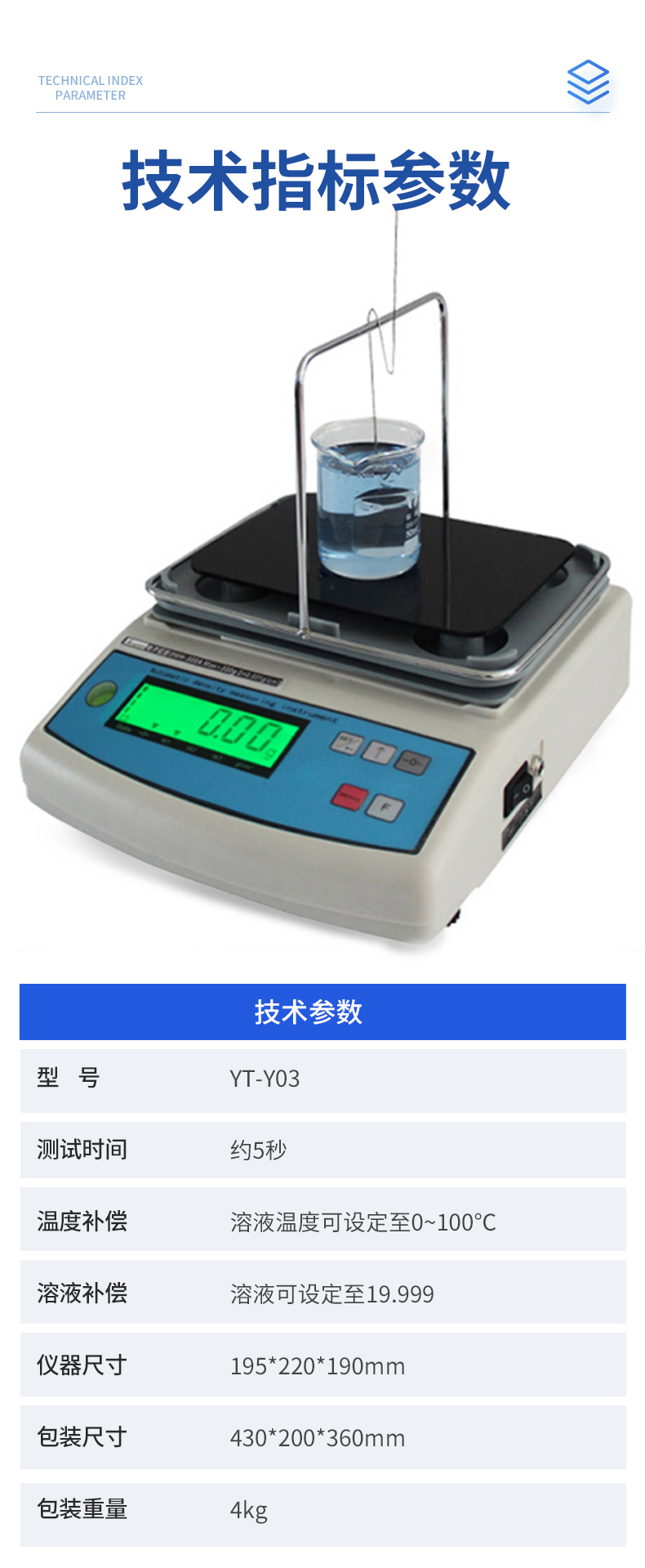 | YT-Y01 称重范围:0.01-300g 称重精度:0.01g 密度精度:0.001g/cm3 | YT-Y02 称重范围:0.01-600g 称重精度:0.01g 密度精度:0.001g/cm3 | YT-Y03 称重范围:0.005-300g 称重精度:0.005g 密度精度:0.0001g/cm3 | 测试种类 化工溶液、化工助剂、现代能源、石油燃烧、药剂、油漆涂料、沥青、食用油等各种液体 | 测试时间 约5秒 | 显示值 密度、体积 | 温度补偿 溶液温度可设定至0~100℃ | 溶液补偿 溶液可设定至19.999 |