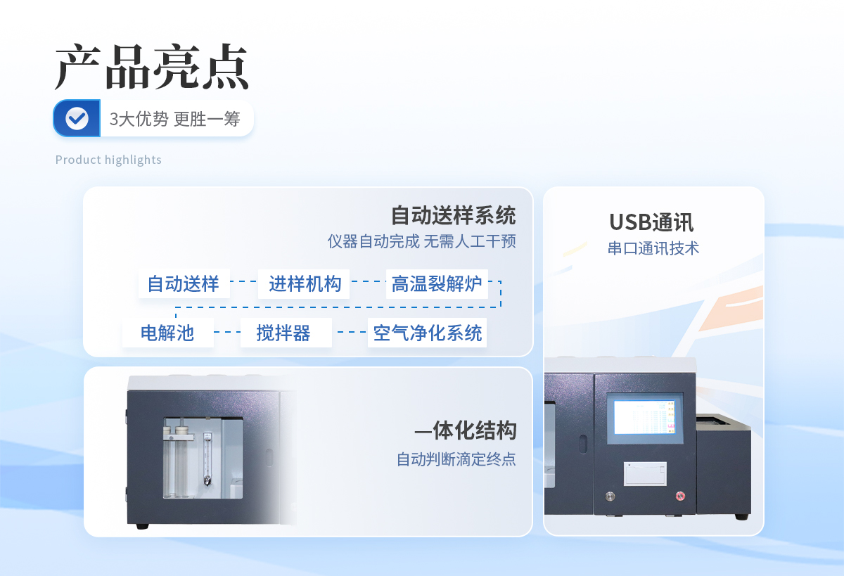 | 1、 手自一体化自动送样系统,将自动送样、进样机构、高温裂解炉、电解池、搅拌器、空气净化系统等部件巧妙地结合在一起,使仪器结构更加紧凑,更加合理、更加稳定。可在线式插队添加样品,无需人工送样,自动化程度高,若样品少也可采用手动送样方式。 | 2、采用—体化结构,自动判断滴定终点,缩短了实验时间。所有关键部件均采用了设计理念及进行了严格的控制,确保仪器能长时间稳定运行。 | 3、采用特别的数据采集网络及多级校正技术,确保高、中、低硫含量测试结果的准确性。 | 4、送样机构采用电子电解液分子浓度采集电路,可靠性高,不会产生过电解现象。 | 5、串口通讯技术,可采用usb通讯,兼容性好,具有广泛的适用性。 | 6、自由设置送样时间及预置温度,采用进口霍尔元件控制送样位置。 | 7、采用刚玉瓷舟,减少卡样的可能。一次可放1-24个样由程序控制实现自动升温、控温、送样、测定,结果自动存盘、自动打印,并可中途在线式插队添加试样,大大地提高了工作效率,真正实现无人值守; | 8、采用库仑滴定法进行测定,测定时间可根据不同试样自动判断,速度优于艾士卡重量分析法和高温燃烧中和法; |