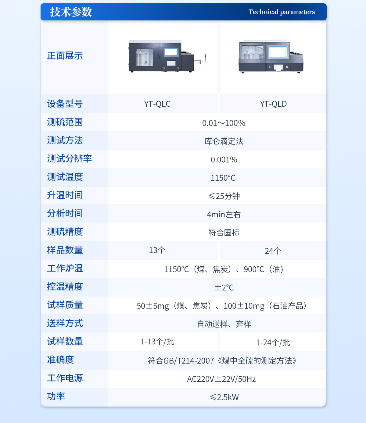 | 测硫范围:0.01~100% | 测试方法:库仑滴定法 | 测试分辨率:0.001% | 测试温度:1150℃ | 升温时间:≤25分钟 | 分析时间:4min左右 | 测硫精度:符合国标 | 样品数量:24个 | 工作炉温:1150℃(煤、焦炭)、900℃(油) | 控温精度:±2℃ | 试样质量:50±5mg(煤、焦炭)、100±10mg(石油产品) | 送样方式:自动送样、弃样 | 试样数量:1-24个/批,试验过程可添加/替换试样 | 准确度:符合GB/T214-2007《煤中全硫的测定方法》 | 工作电源:AC220V±22V/50Hz 功率:≤2.5kW |